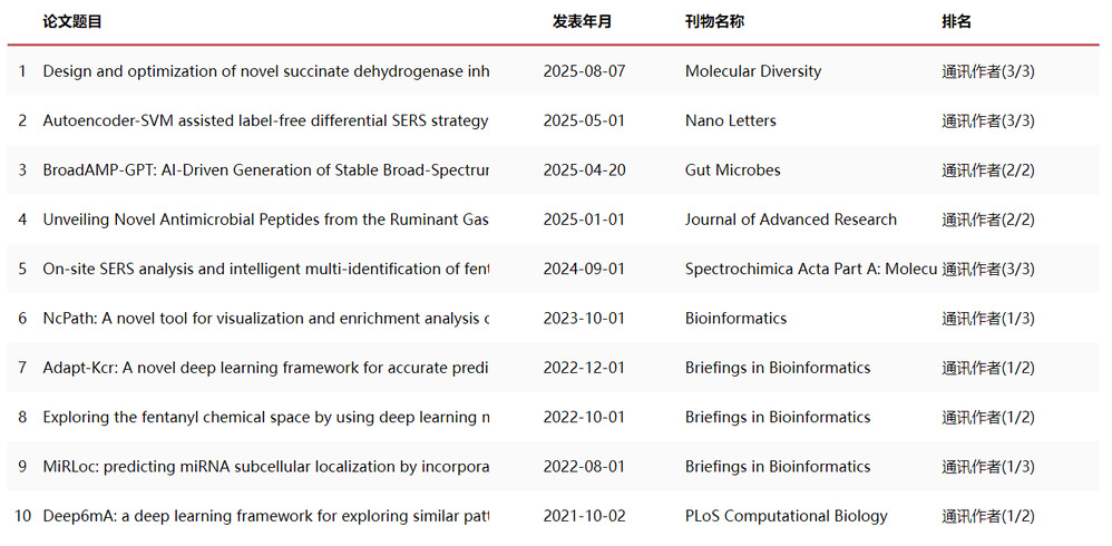 主要从事AI药物设计,以及非编码RNA与表观遗传相关性的研究。目前获得国家重点研发计划(任务负责人),国家自然科学基金面上项目,中国药科大学高层次人才引进经费资助,南京农业大学高层次人才引进经费资助,香江学者计划资助等多项资助。BMC Bioinformatics的编委,近年来以第一作者或通讯作者身份在Gut Microbes, Nano Letters, Bioinformatics, Briefings in Bioinformatics, Journal of Advanced Research, PloS Computational Biology 等TOP学术期刊发表SCI 论文30篇,其中包括2篇ESI高被引论文。