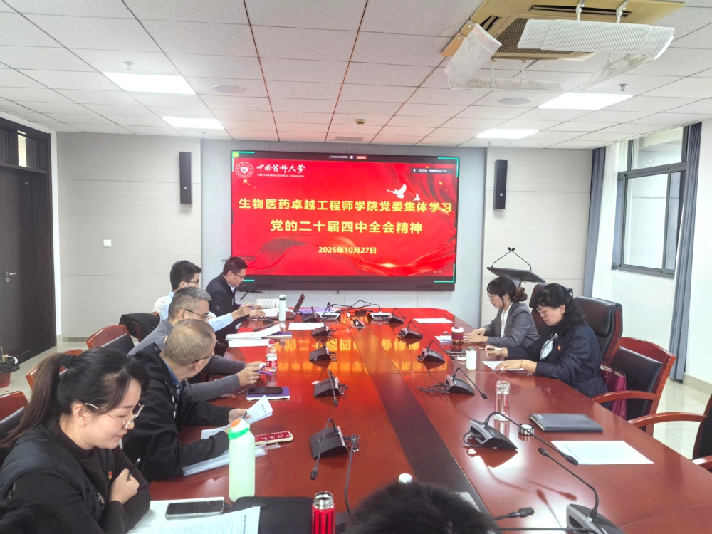 2025年10月27日,中国药科大学生物医药卓越工程学院党委在江宁校区行政楼701会议室举行专题学习会,集中学习党的二十届四中全会精神。学习会由生物医药卓越工程师学院党委书记王欣然主持,生物医药卓越工程师学院党委副书记季景玉领学,全体党员参加学习。